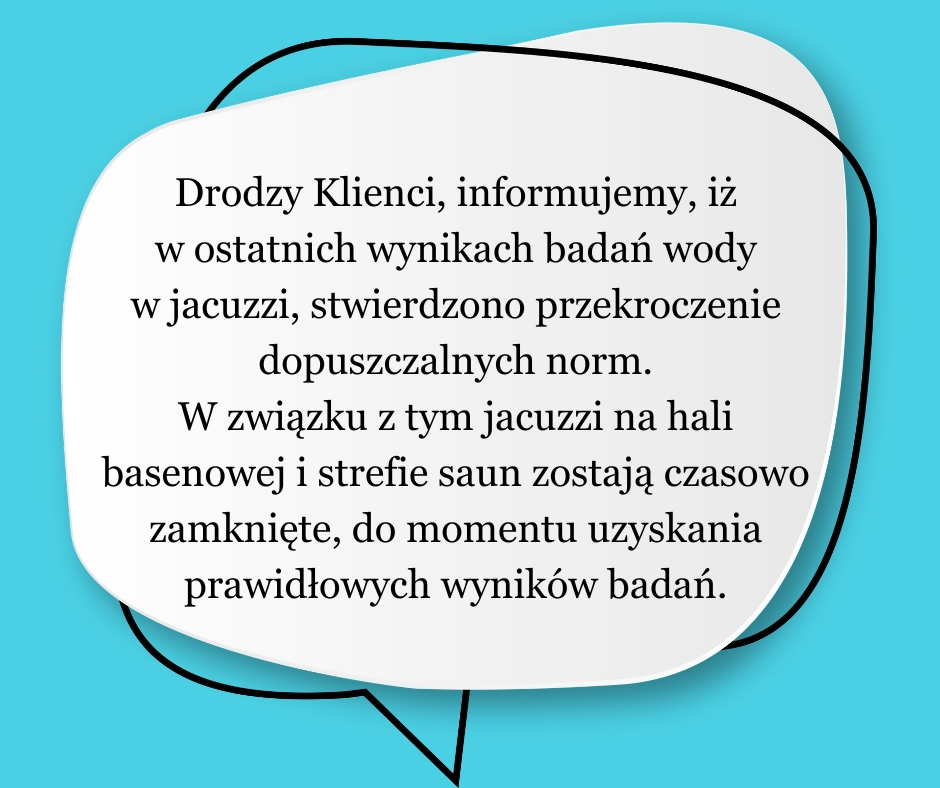 W związku z tym jacuzzi na hali basenowej i strefie saun zostają czasowo zamknięte, do momentu uzyskania prawidłowych wyników badań.